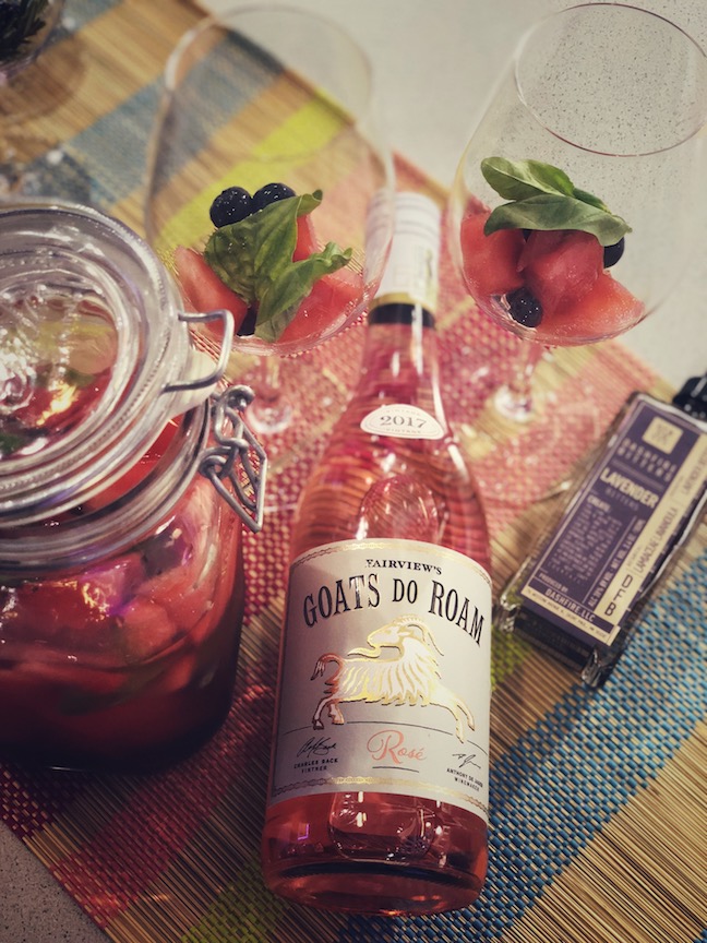 Again, get to know the base of your rosé before heading into this recipe.  For example, using a Shiraz based rosé?  You might want to go with some heavier, richer fruit like black cherries or IMG_0274 (1)blackberries to snuggle up to the flavors of the wine.  I used Fairview’s ‘Goats do Roam’ Rosé from South Africa – which is a base of Grenache, Gamay + Cinsault.  The wine itself is a bit gentler, so I used blueberries and watermelon as my base fruit.  I also added a couple of handfuls of basil to this one to lift some lighter flavors from the mix.  In addition, I used a few tinchers of Lavender Bitters from one of Minnesota’s local bitters companies, Dashfire BittersThe lavender was a fun addition, as it added a ton of depth and flavor overall to my sangria.